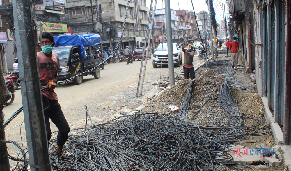 काठमाडौंको पुतलीसडकका सडकपेटीमा खसाइएका तारका गुजुल्टा । पुराना पोल फेर्न बिजुली, टेलिफोन, इन्टरनेट र केबलका तारहरु सडकपेटीमा खसाइएको हो । अलपत्र पारिएका तारका कारण फुटपाथबाट हिँड्न नसकिने स्थिति भए पनि कुनै निकायलाई कामको हतारो छैन । यसमा कामदार पनि असन्तुष्ट छन् । ‘सरकारले विद्युतीय तारलाई भूमिगत गर्ने भनिरहेका बेला किन हतार-हतार पोल फेर्न थालिएको होला !’ यो उनीहरुको जिज्ञासा हो ।
