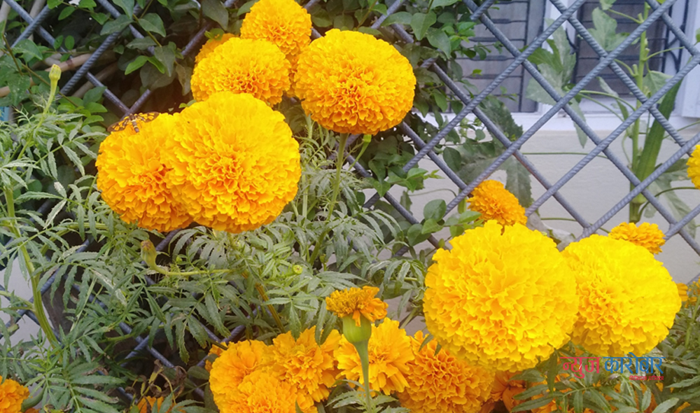 भक्तपुरको मध्यपुर ठिमी नगरपालिका १ लोकन्थलीस्थित सुमन दाहालका घरमा फुलेका सयपत्री र मखमली फूल । मलमासका कारण चाडपर्व एक महिना पछि धकेलिए पनि गत वर्षमै जस्तो समयमा रोपिएका सयपत्री र मखमली दसैँ नलाग्दै फुलेका छन् । भक्तपुरमा ठूलो मात्रामा व्यावसायिक फूलखेती गर्ने गरिन्छ ।