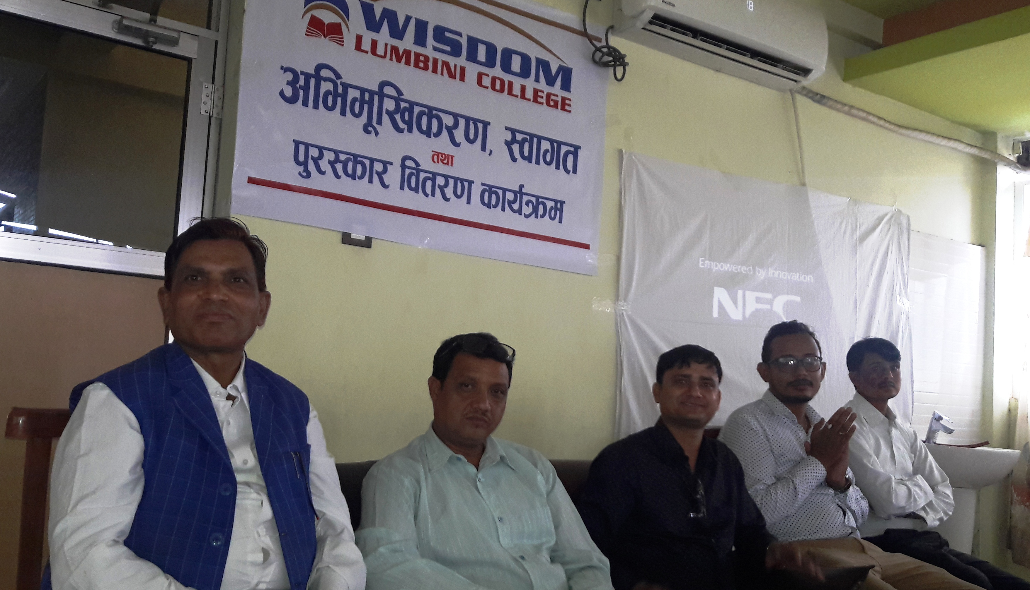 लुम्बिनी। विज्डम कलेज बुटवल–६ को आयोजानमा अभिमुखिकरण, स्वागत तथा पुरस्कार वितरण कार्यक्रम गरिएको छ । कलेजका अध्यक्ष मधुकर शर्माका अध्यक्षतामा भएको कार्यक्रममा होटल तथा रेष्टुरेन्ट व्यसायी संघ रूपन्देहीका अध्यक्ष समुन्द्र जिसीको प्रमुख आतिथ्यता रहेको थियो । कार्यक्रममा बोल्दै प्रमुख अतिथि जिसीले रूपन्देही हस्पटालिटी क्षेत्रमा संभावना बोकेको क्षेत्र भएको कारणले होटल लाईनको अध्ययनमा लाग्ने विद्यार्थीको भविश्य समुज्जवल भएको बताएका थिए । बुटवलमा अन्तरराष्ट्रियसम्मेलन केन्द्र निर्माणाधीन, भैरहवामा अन्तराष्ट्रिय विमानस्थल निर्माणाधीन रहेको र विश्व शान्तीको मुहान लुम्बिनी पनि रून्देहीमा नै रहेको कारण सेवामुलक व्यवसायीको भविश्य उच्च रहेको उनको भनाई रहेको थियो ।
