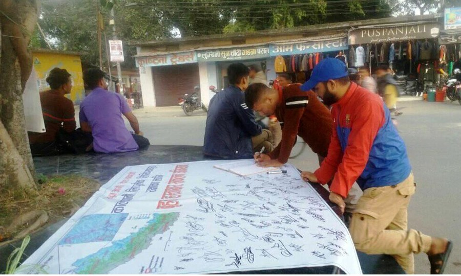 कञ्चनपुरमा कालापानी, लिपुलेक र लिम्पियाधुरा रक्षाका लागि हस्ताक्षर अभियान सुरु गरिएको छ । सीमा रक्षाका लागि युवा जागरण अभियान दार्चुलाले हस्ताक्षर अभियान सुरु गरेको हो । ‘युवा जागौँ, देश बचाऔँ’ भन्ने मूल नारासहित हस्ताक्षर अभियान सुरु गरिएको अभियानका संयोजक मदन गिरीले बताए ।