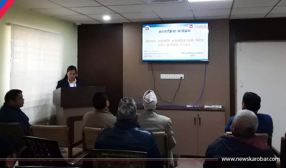 त्यस्तै राष्ट्रिय जनमोर्चाका जिल्ला अध्यक्ष गोविन्द सुवेदीले समेत राज्यलाई दोहोरो खर्च हुनबाट बचाउनुपर्ने बताए । उनले नागरिकता प्राप्त गर्ने बित्तिकै मतदाता नामावलीमा नाम दर्ता हुने प्रक्रियालाई निर्वाचनको मिति तोकिए पनि रोक्न नहुने बताए । कार्यक्रममा जिल्ला निर्वाचन अधिकारी निर्मला रेग्मीले मतदाता नामावली अद्यावधिक सम्बन्धि प्रस्तुतीकरण राखेकी थिइन् ।