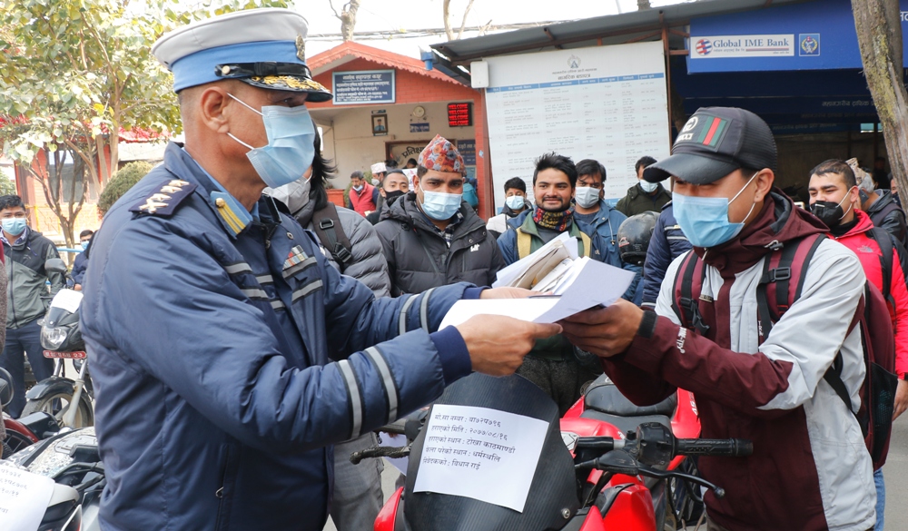 हराएका मोटरसाइकल सम्बन्धित धनीलाई जिम्मा लगाउँदै ट्राफिक प्रहरी । फाइल तस्बिर ।